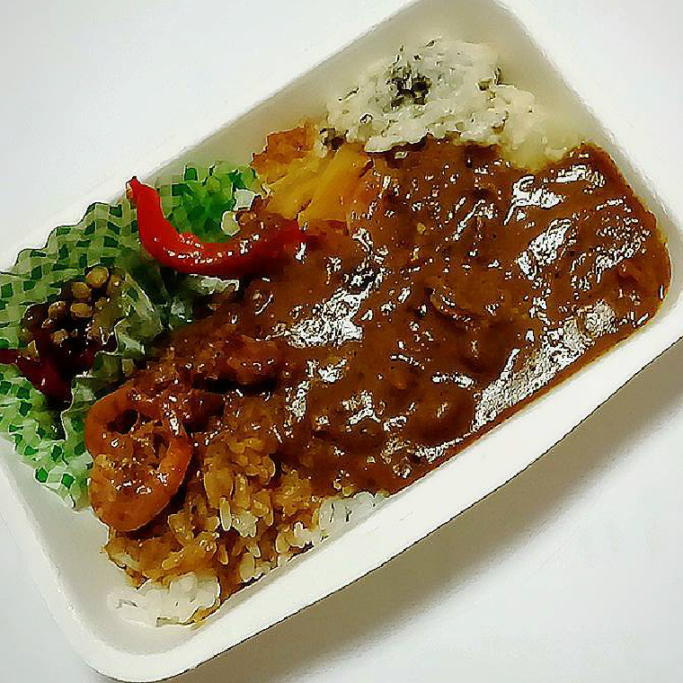 給⾷カレーに⼿を加え、ラマンチャカレーに仕上げました。
